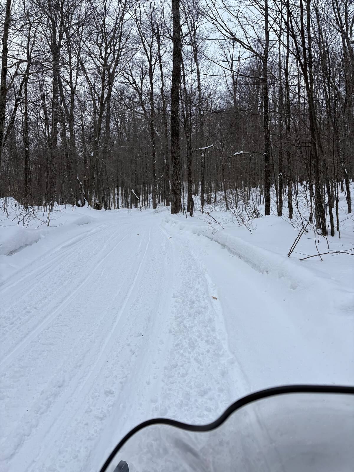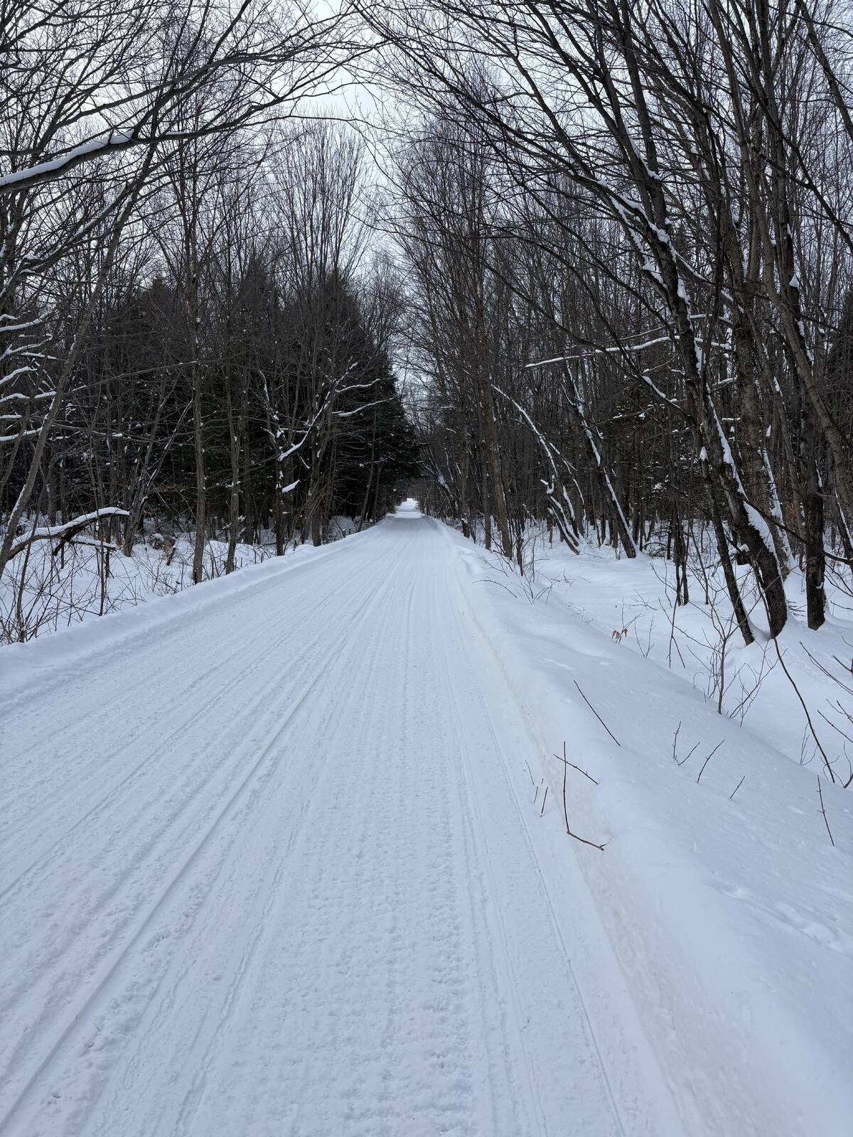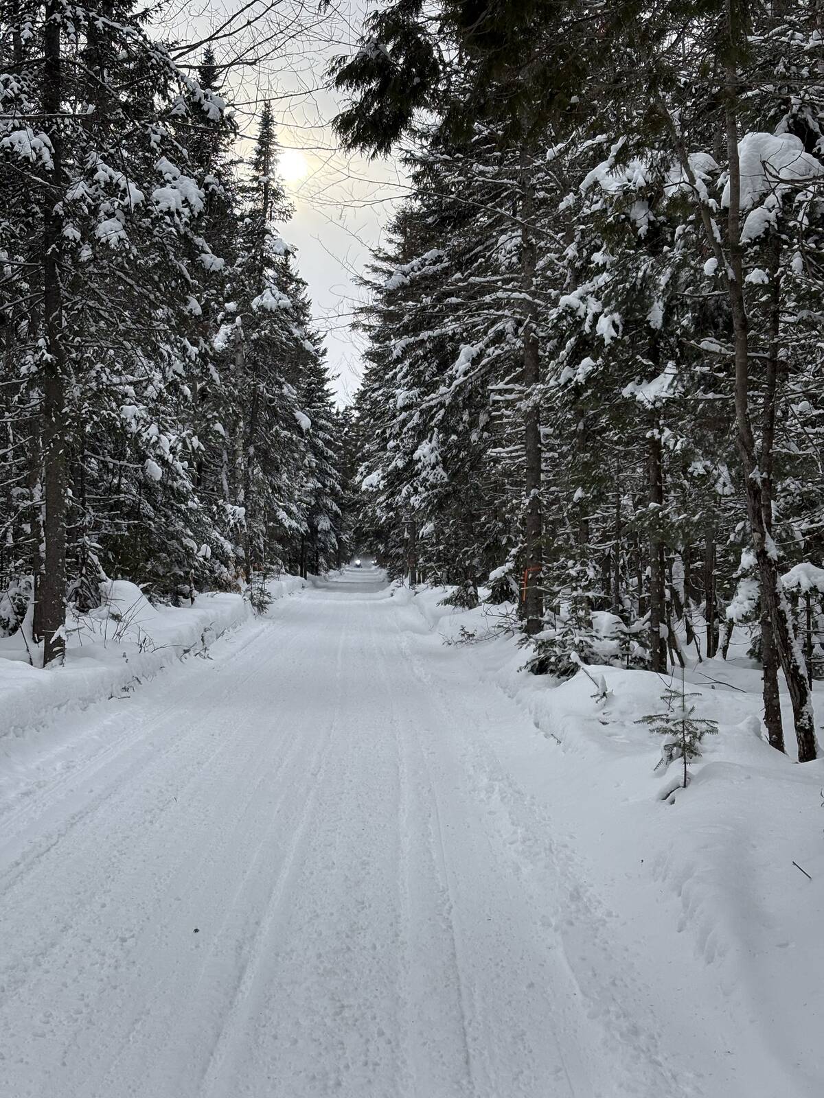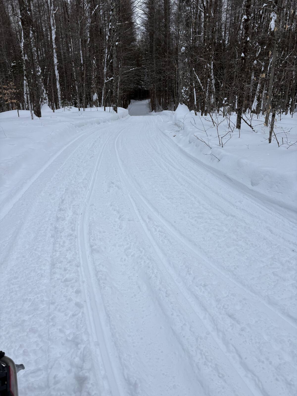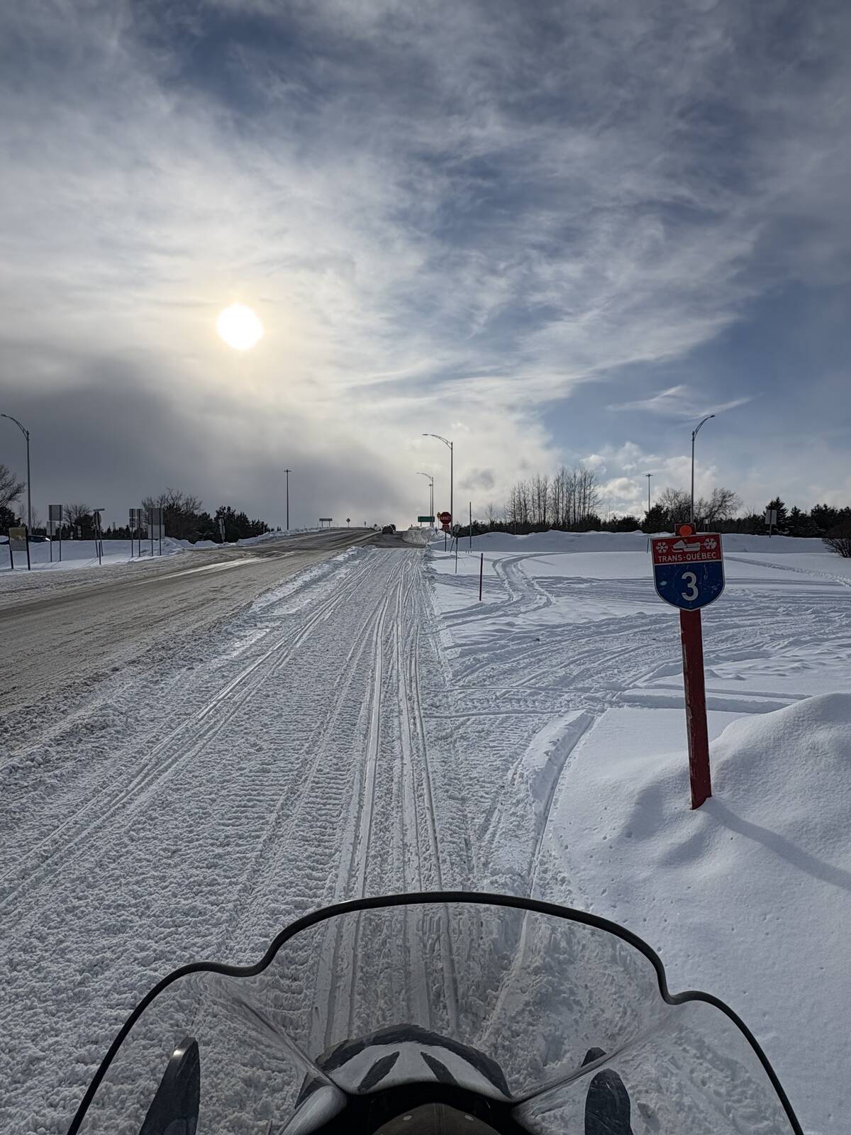 Down and onto the Riviere St Maurice. Right turn and down under 2 bridges and local trail back to TQ3, home stretch now. In Shawingan now is groomer 3. Headed west toward home. I pass him and this trail needs his attention for sure but we can see the barn almost from here time to bang it out.