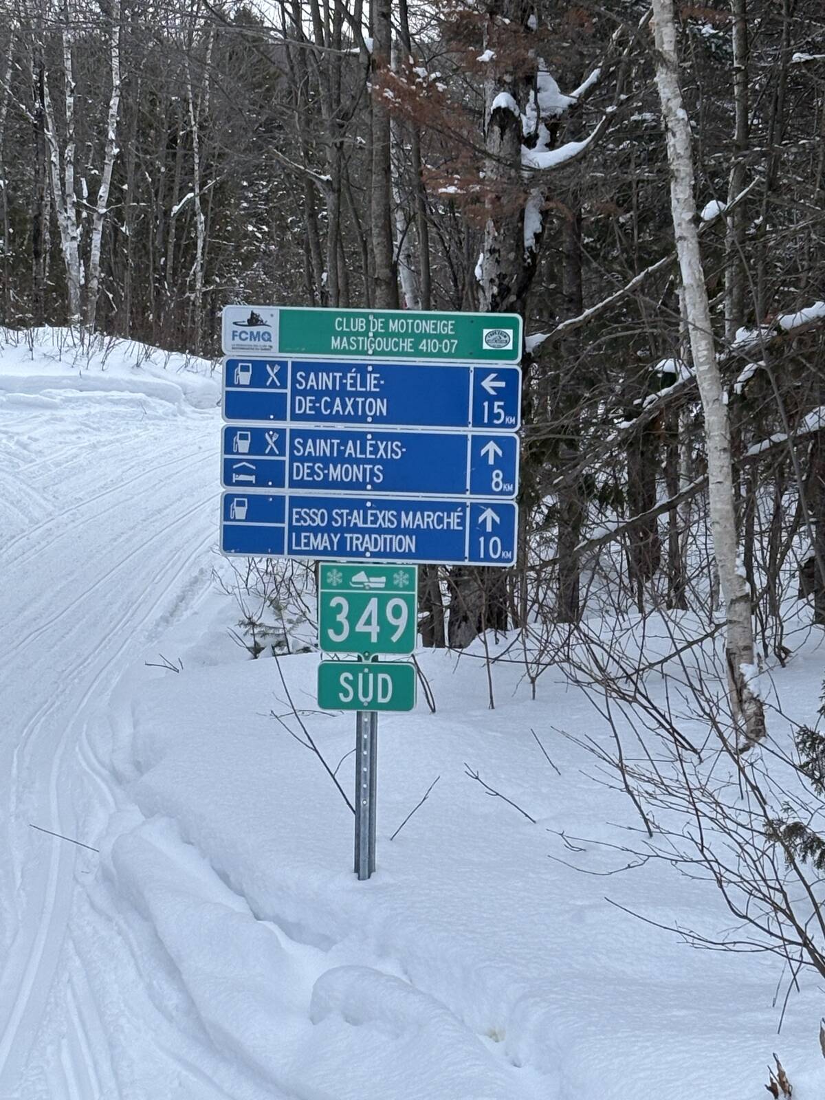 Through St Elie and I continue up to join 349. Rode up through Lac a l’eau Claire (Florida Snowman long gone) so far all sleds headed opposite direction. I catch no one and see no one going my way. Just before arriving at 349 junction trail is groomed here. Just ahead is the groomer we are arriving at intersection its here he lets me pass. I continue now on 349 heading for the TQ23 to run back to Shawinigan. Not far up 349 at a pull off big group of tourists. I thank my lucky stars they are parked,